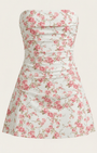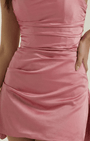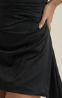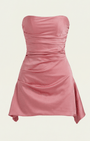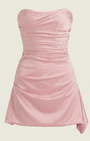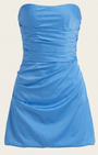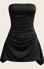 Questo abito corto senza spalline Aurazio incarna una sofisticazione giocosa, perfetta per chi ama muoversi con sicurezza in ogni occasione, dai cocktail party alle serate di ballo. Il corpetto in stile bustier garantisce sostegno e definisce la figura, mentre il drappeggio ruché crea profondità visiva. La gonna mini svasata, con un orlo asimmetrico, aggiunge un tocco moderno e una finitura lucida cattura la luce ad ogni movimento.