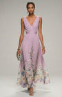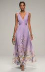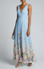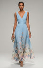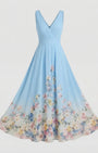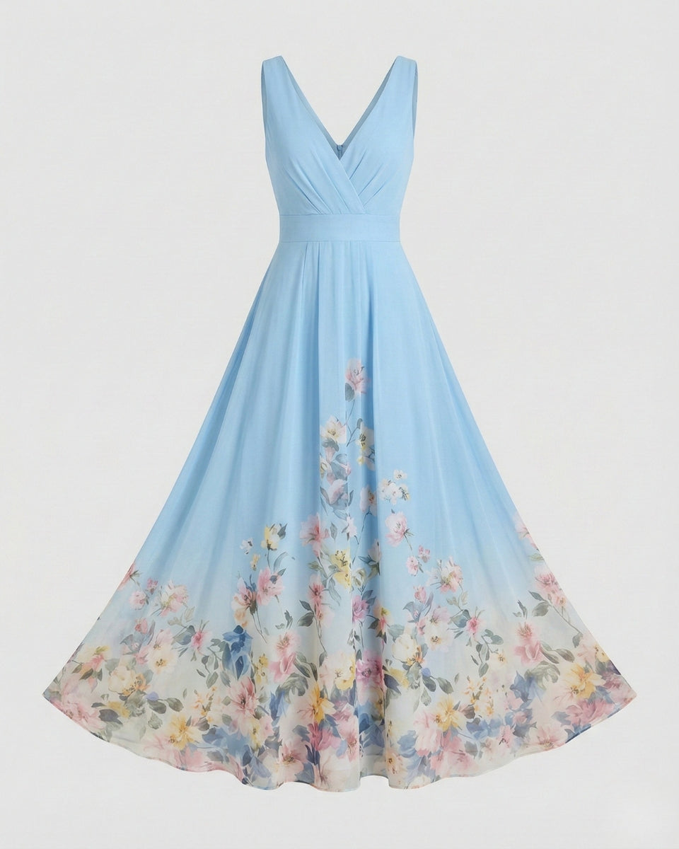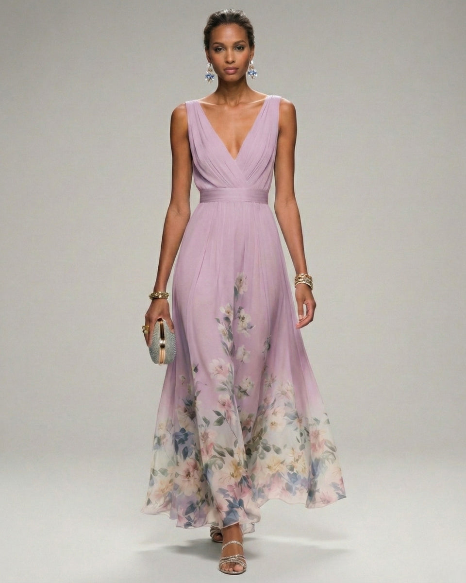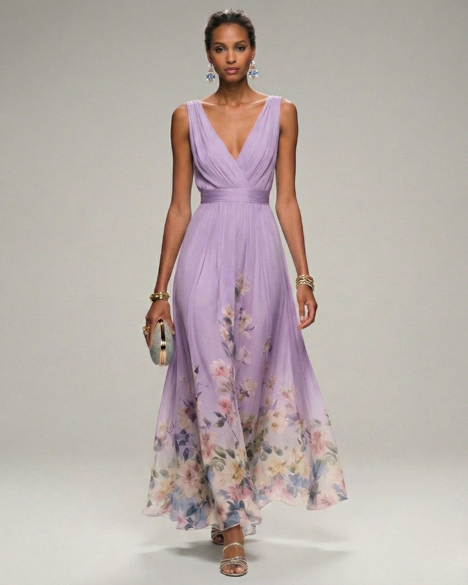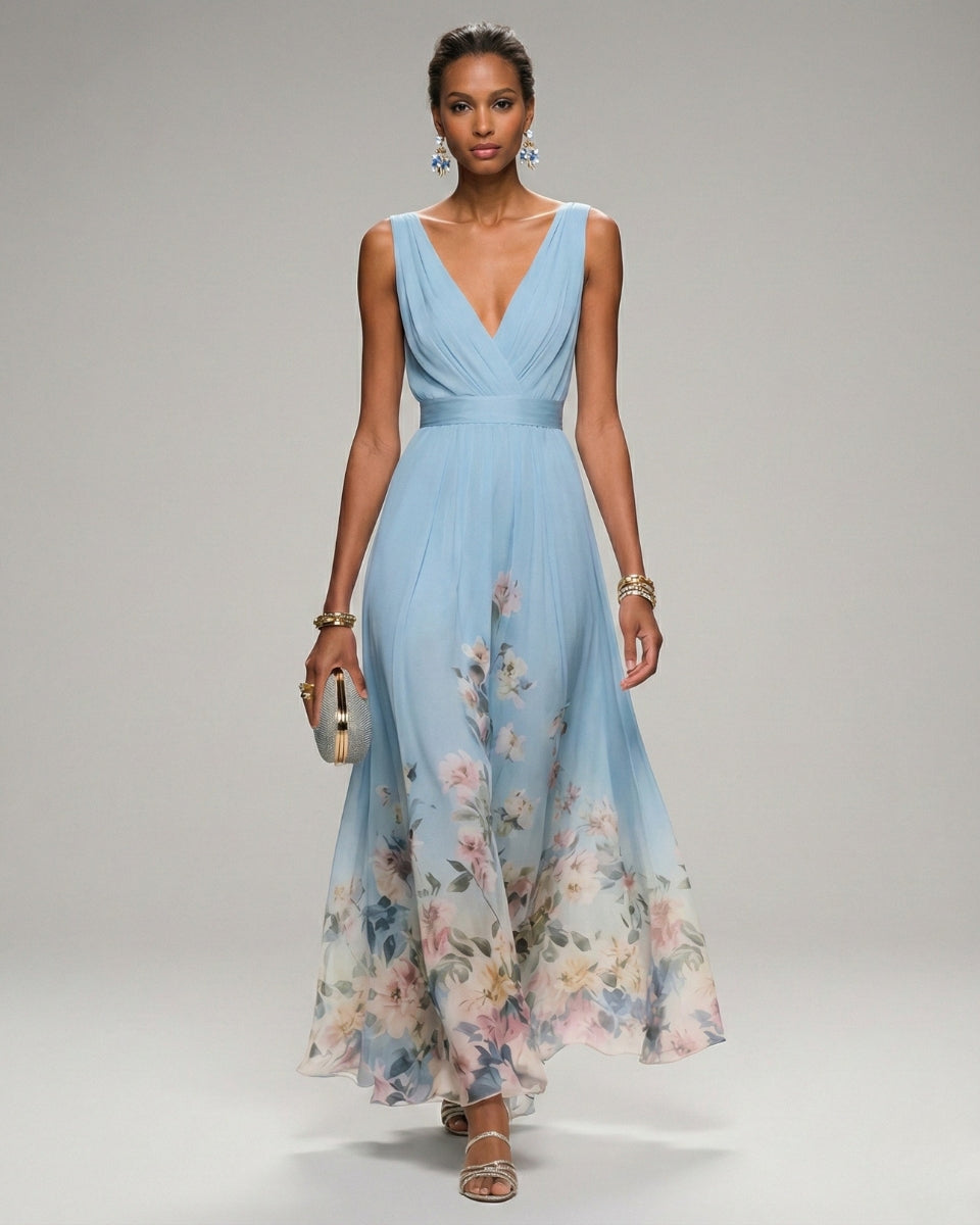 Incanto Crepuscolare: Vestito Maxi a Scollo a V con Stampa Floreale Gradiente