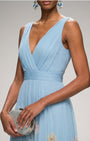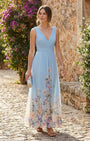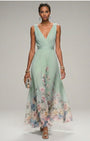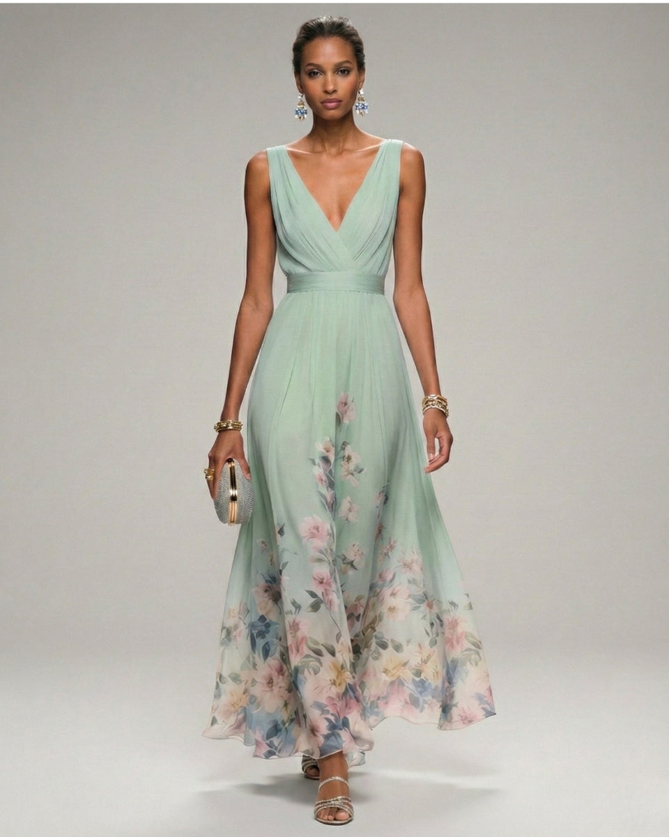 Questo vestito maxi senza maniche, firmato Aurazio, cattura l'occhio con una delicata stampa floreale a gradiente che sfuma dal solido al motivo di fiori. Il corpetto avvolgente definisce la silhouette con linee morbide, mentre lo scollo a V profondo aggiunge un tocco di raffinata modernità. La gonna in stile A-line scorre fluidamente fino al pavimento, offrendo comfort e movimento, perfetto per eventi all'aperto, matrimoni o serate eleganti.