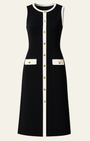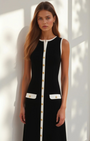 Abito midi senza maniche di Aurazio, pensato per un’eleganza pulita e senza sforzo. Realizzato in una raffinata miscela di cotone, offre una mano morbida e una caduta raffinata che valorizza la silhouette. Il dettaglio a contrasto e i bottoni dorati aggiungono un tocco di lusso discreto, perfetto per aperitivi serali, cene in città o look estivi con i tacchi.
