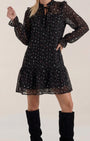 Questo abito mini con volant è la quintessenza della festa senza sforzo: scollatura arricchita da volant, dettagli metallici scintillanti e maniche trasparenti che aggiungono leggerezza al movimento. I puntini metallici creano un tocco festoso, mentre la linea fluida assicura libertà di movimento, perfetta per ballare dall’aperitivo alle celebrazioni. Prodotto da Aurazio, è una scelta versatile per party, appuntamenti o serate fuori.