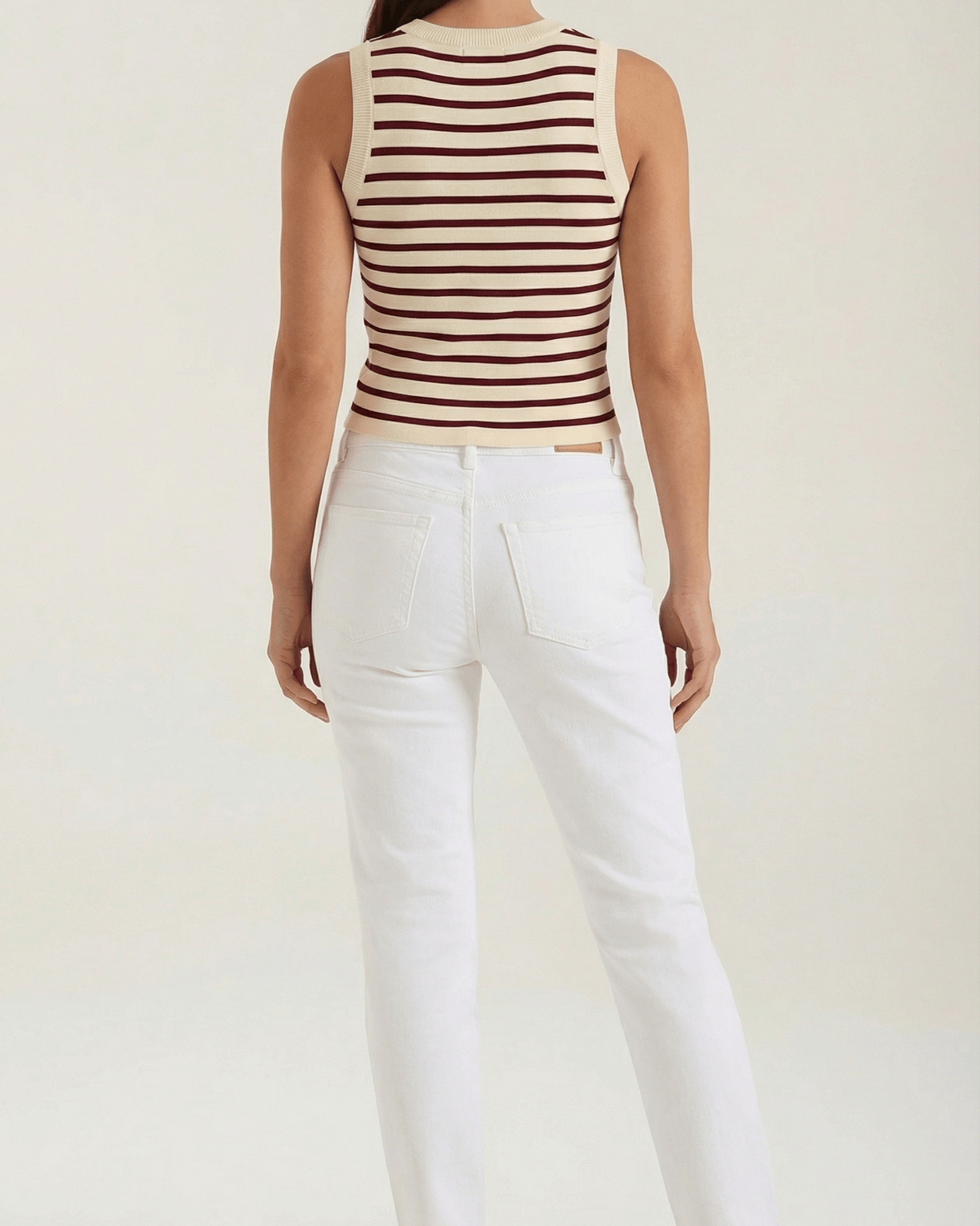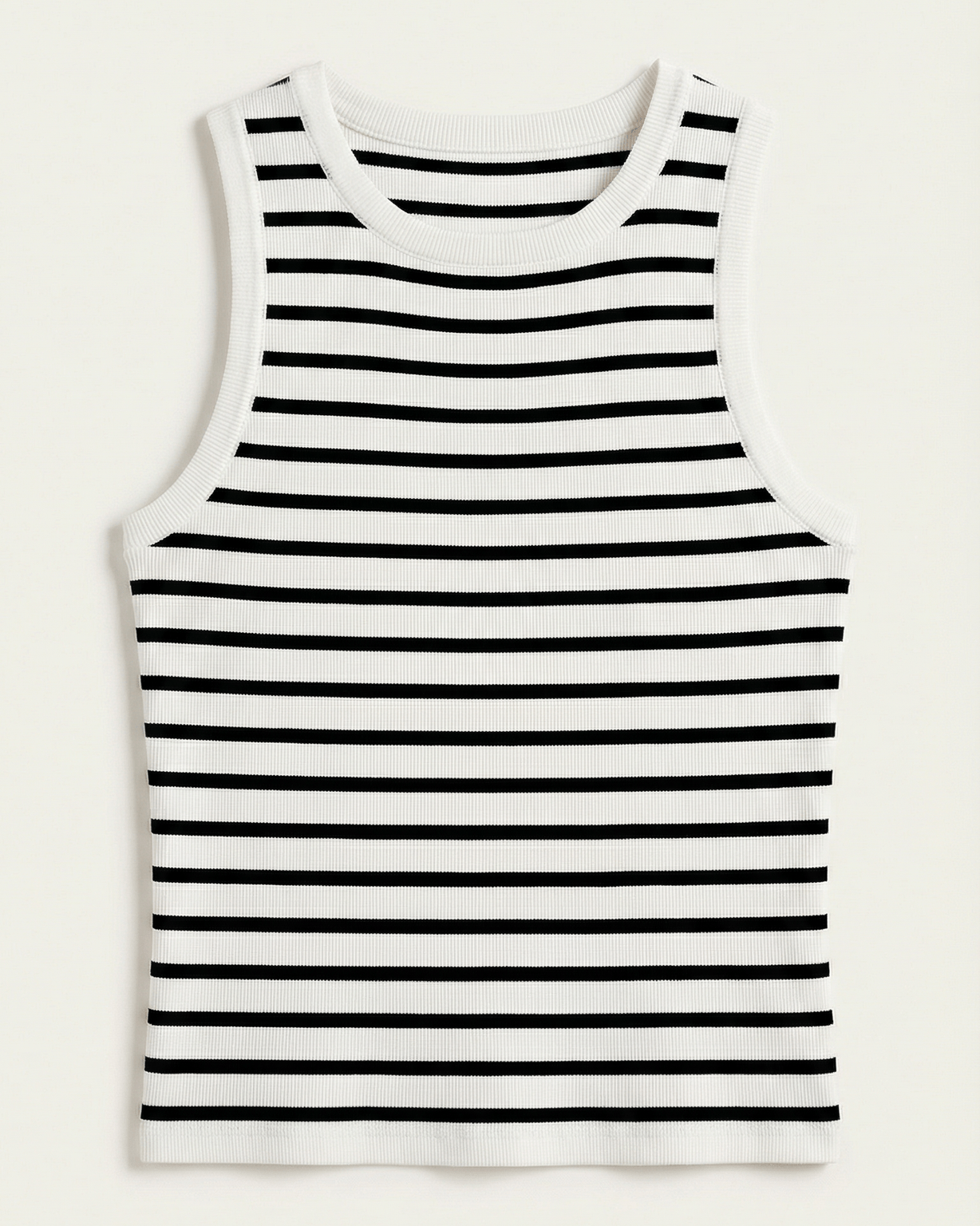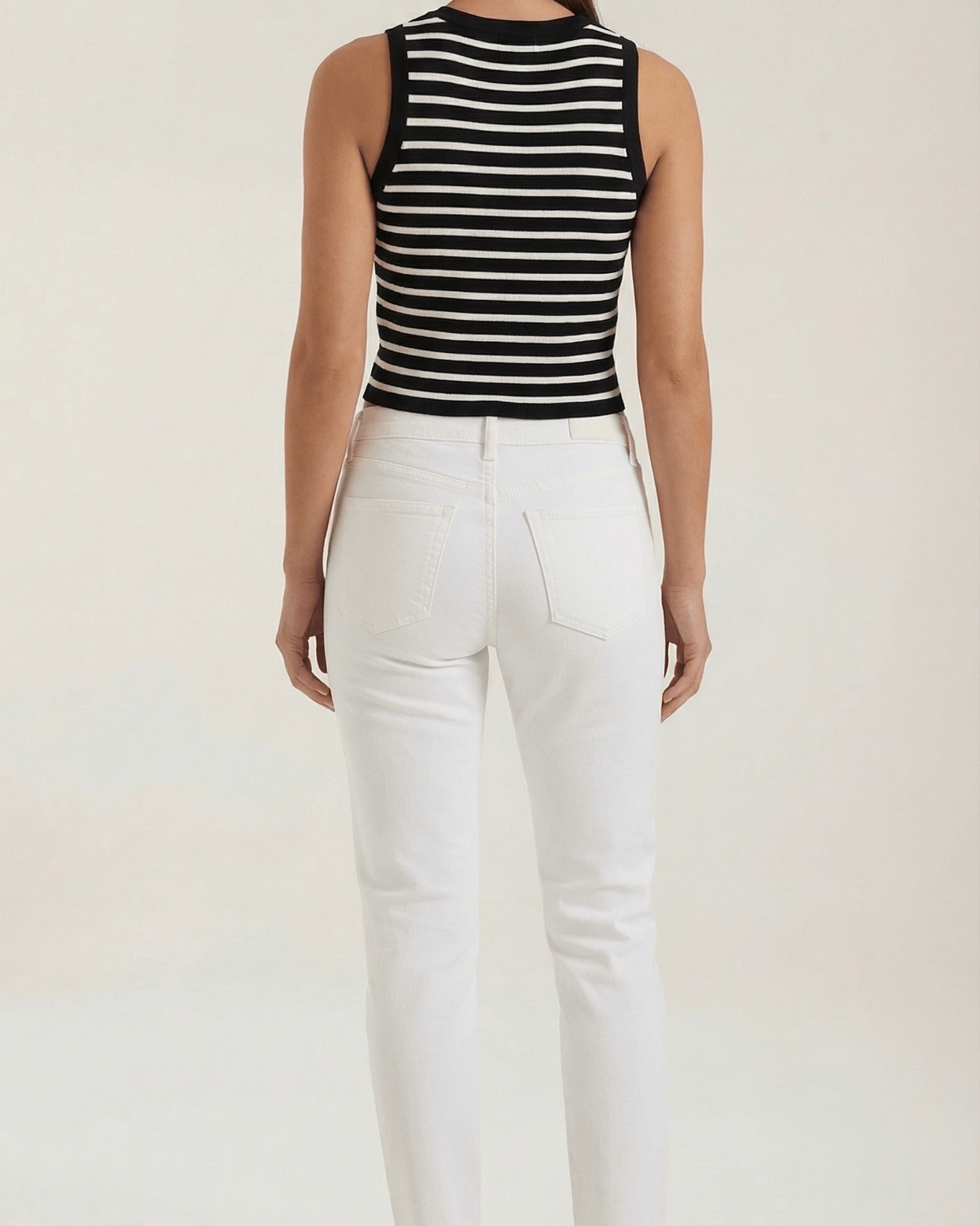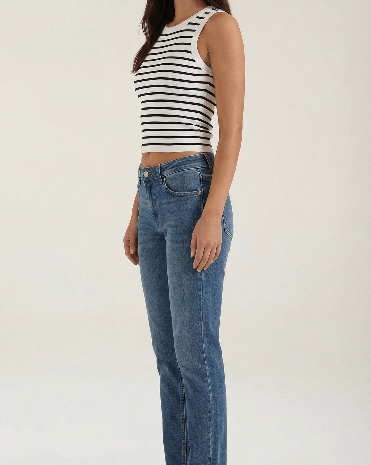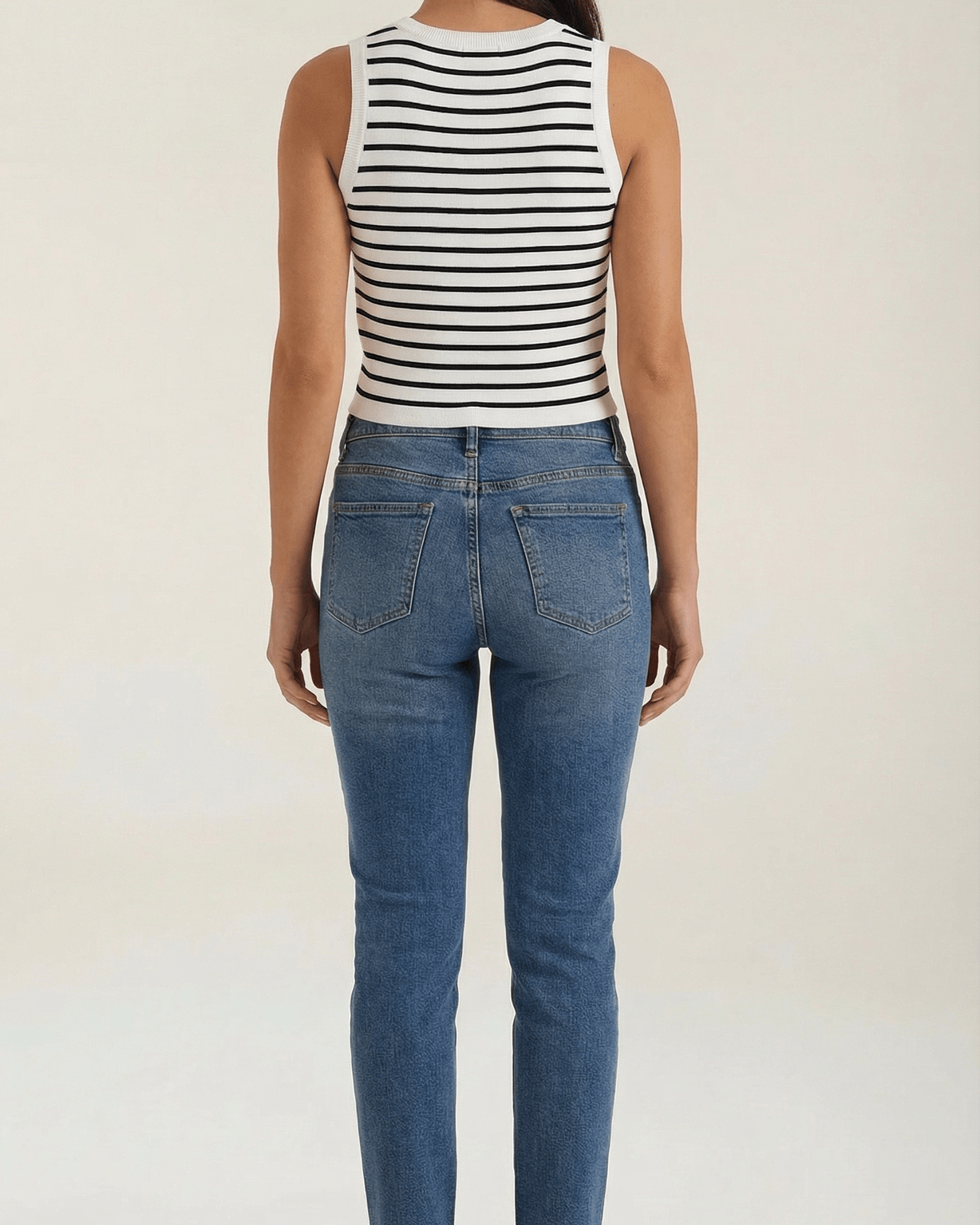 La canotta Aurazio reinterpreta il fascino retrò con righe navy nitide che valorizzano la figura con precisione. Il profilo aderente è definito da una finitura a coste sul girocollo e sulle maniche, conferendo un tocco architettonico. Realizzata in maglia elastica premium con una struttura che mantiene la forma, questa versione cropped è ideale da abbinare a vita alta per look contemporanei, dal giorno alla sera.