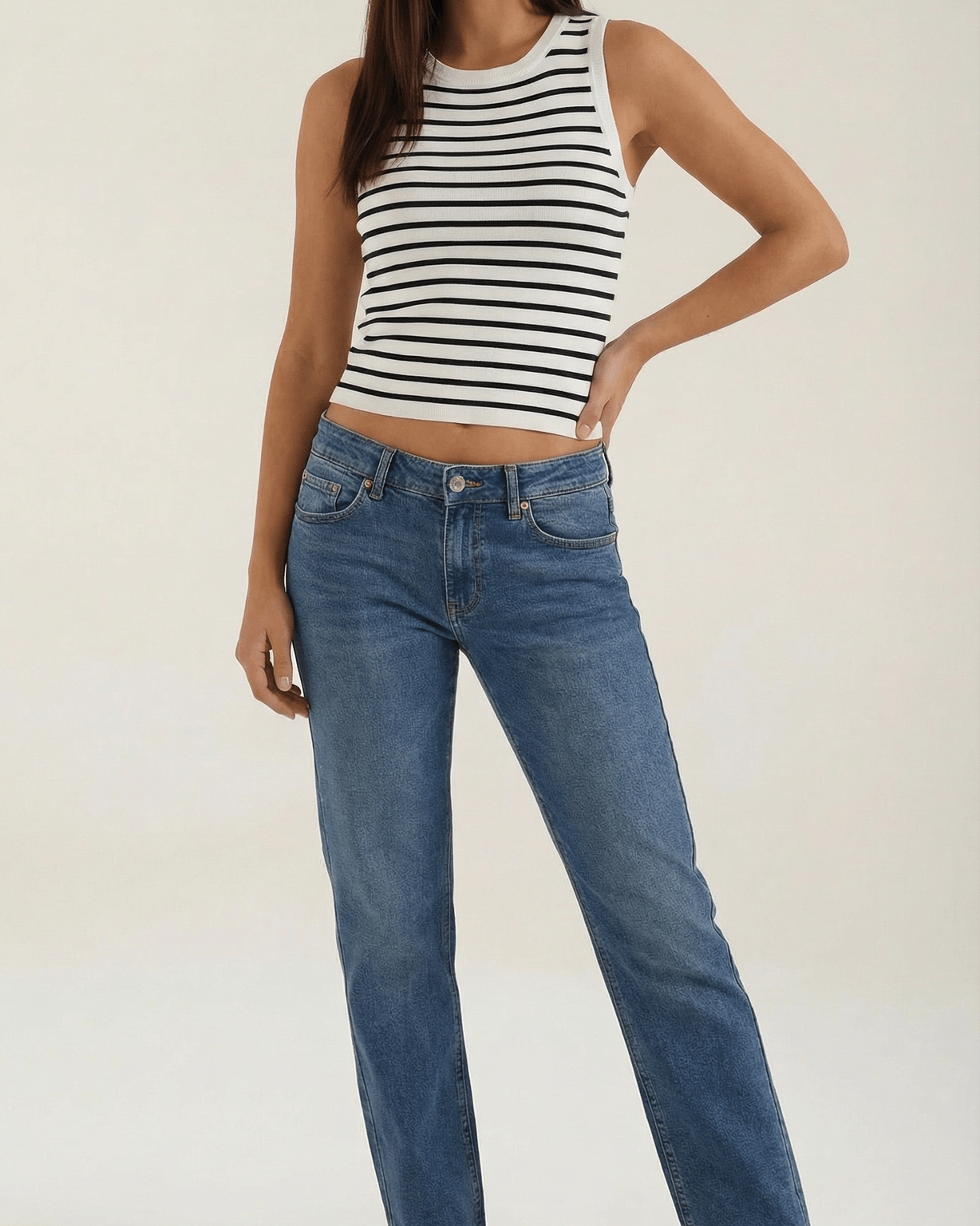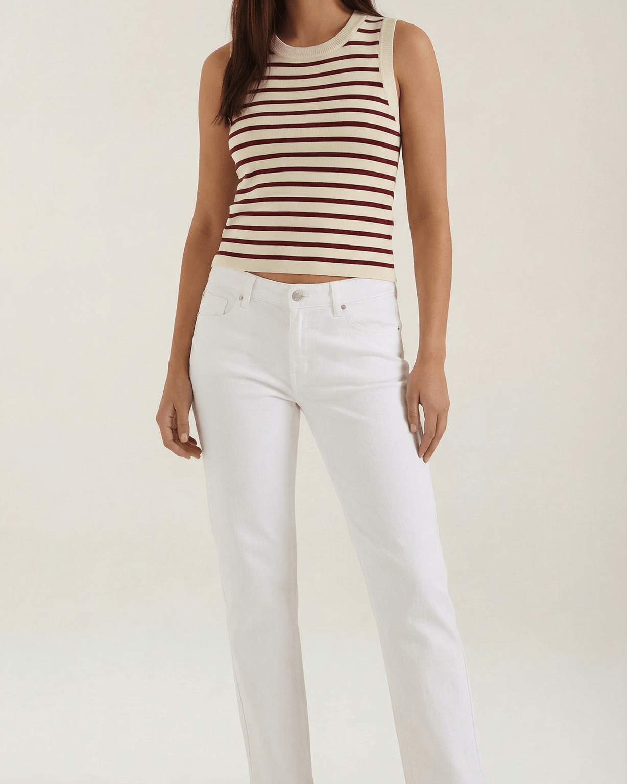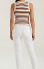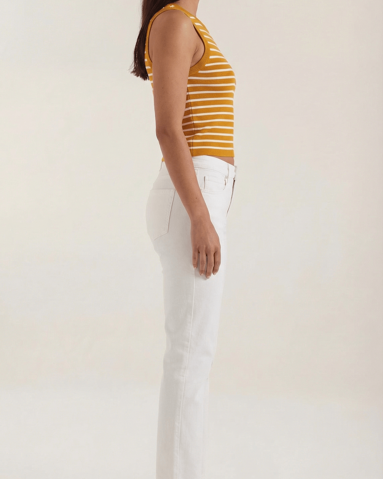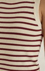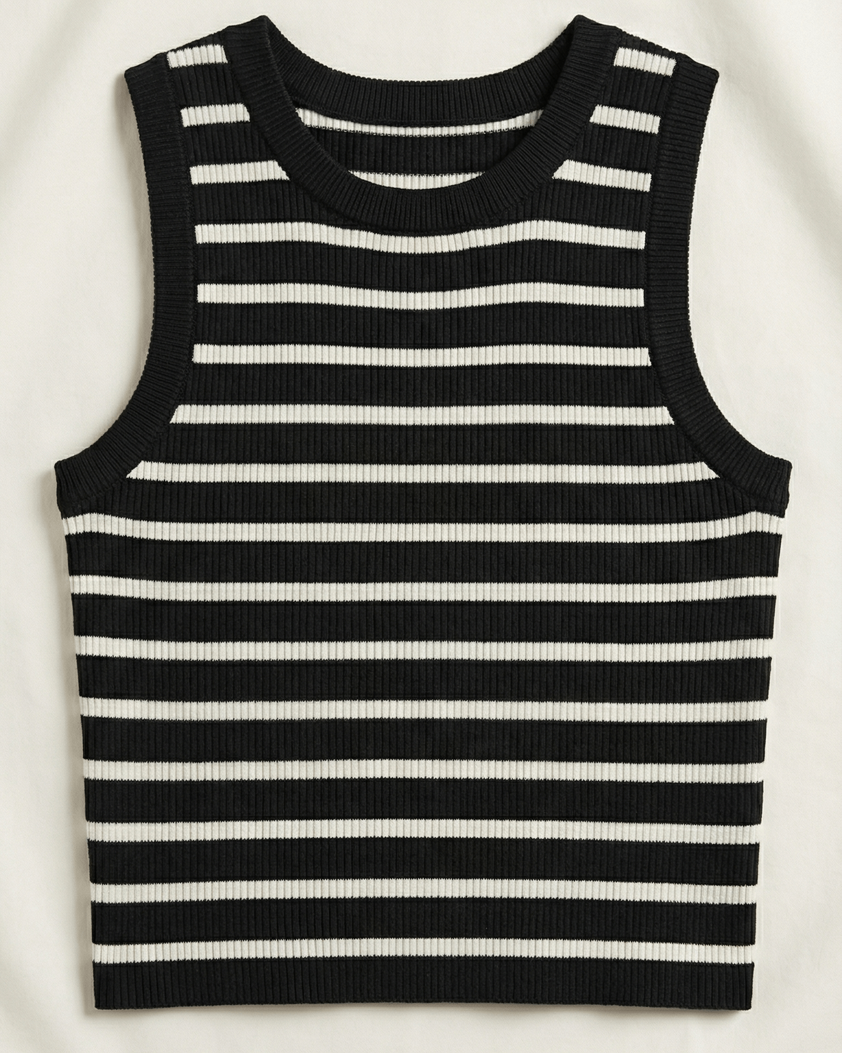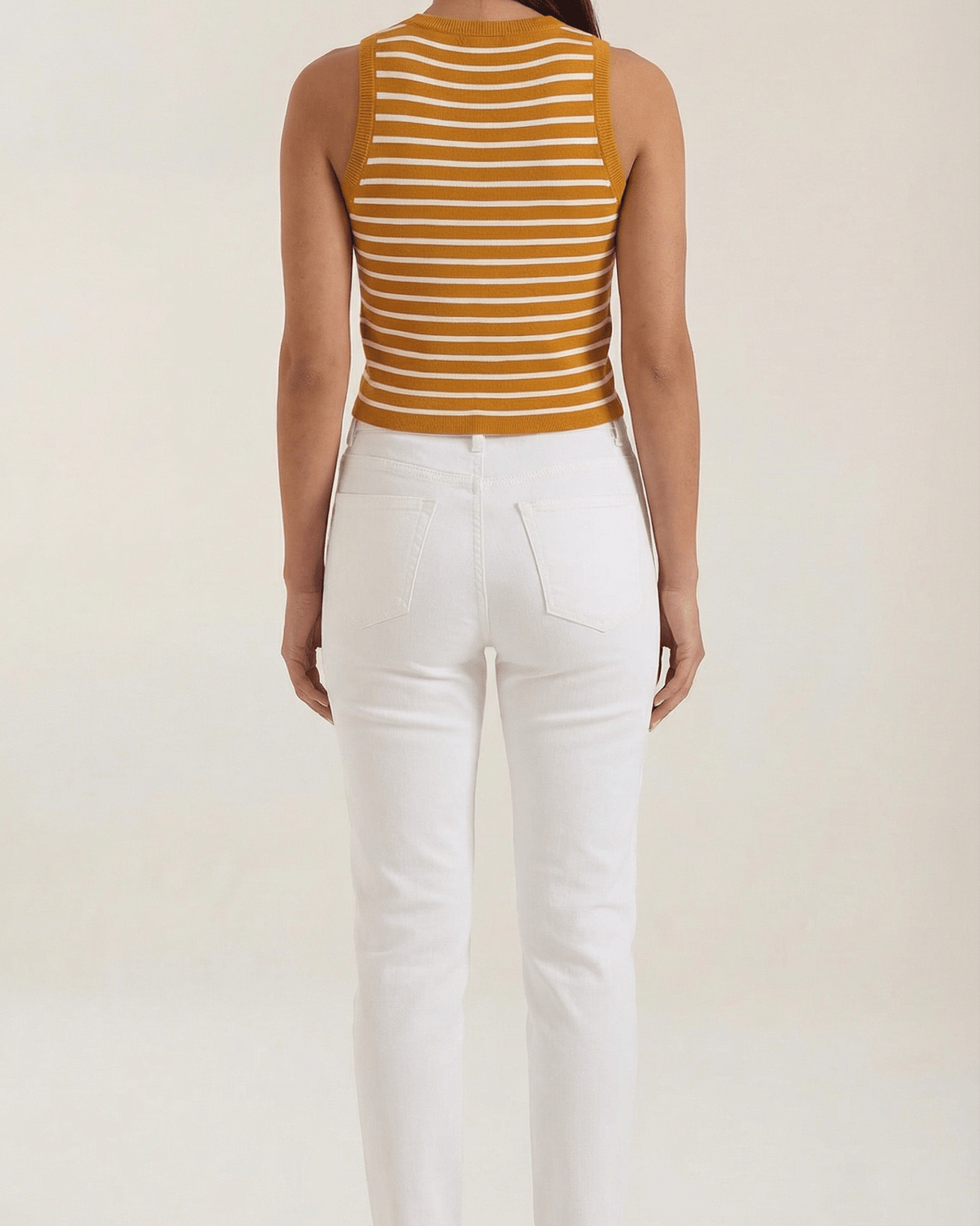 La canotta Aurazio reinterpreta il fascino retrò con righe navy nitide che valorizzano la figura con precisione. Il profilo aderente è definito da una finitura a coste sul girocollo e sulle maniche, conferendo un tocco architettonico. Realizzata in maglia elastica premium con una struttura che mantiene la forma, questa versione cropped è ideale da abbinare a vita alta per look contemporanei, dal giorno alla sera.
