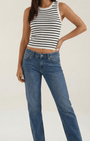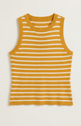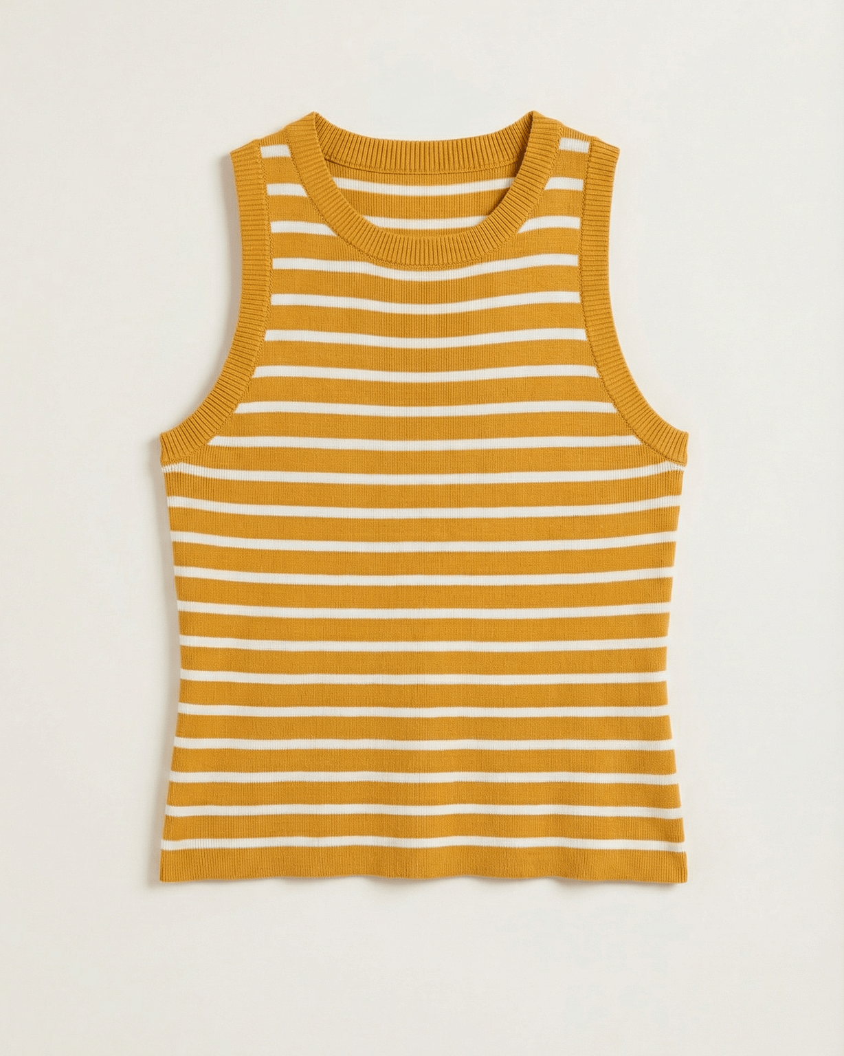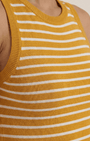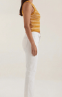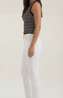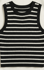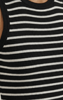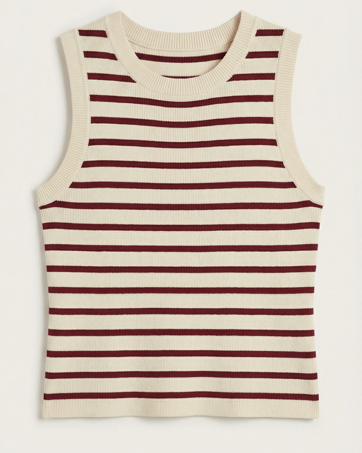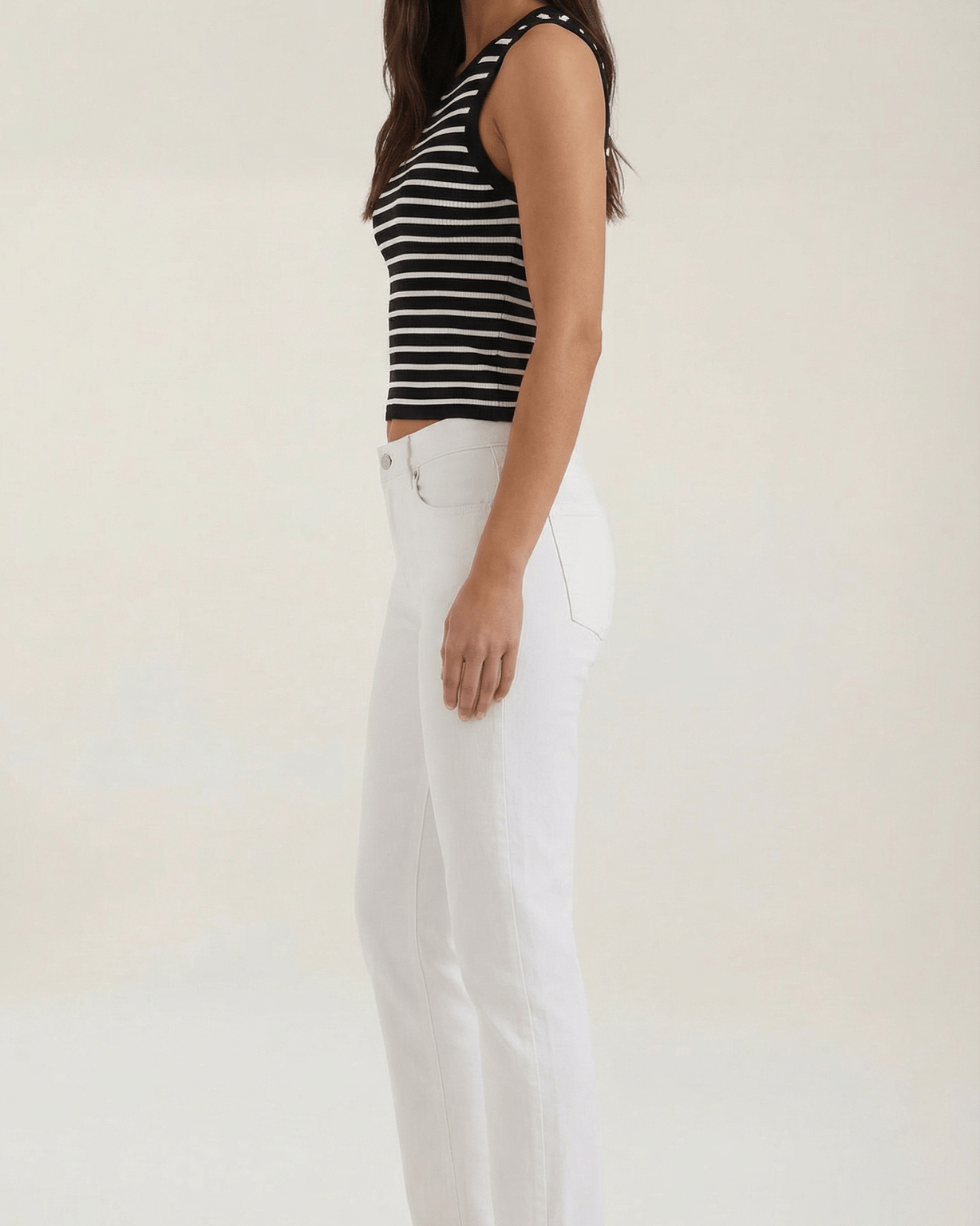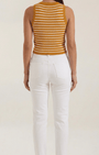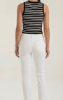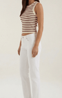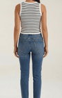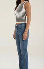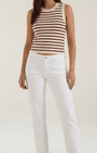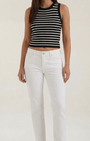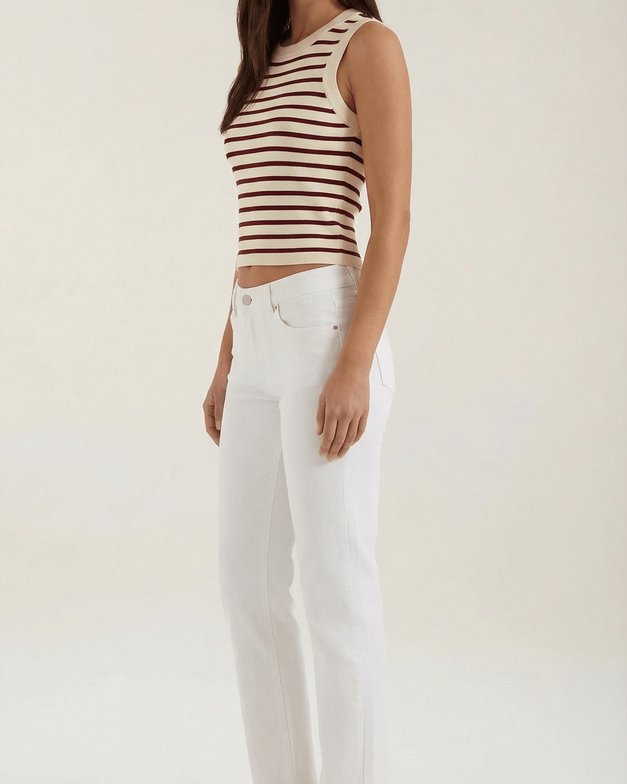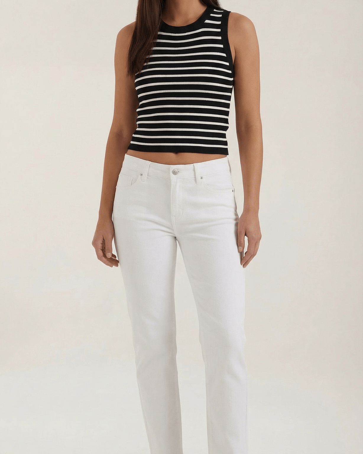 La canotta Aurazio reinterpreta il fascino retrò con righe navy nitide che valorizzano la figura con precisione. Il profilo aderente è definito da una finitura a coste sul girocollo e sulle maniche, conferendo un tocco architettonico. Realizzata in maglia elastica premium con una struttura che mantiene la forma, questa versione cropped è ideale da abbinare a vita alta per look contemporanei, dal giorno alla sera.