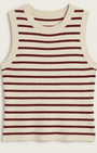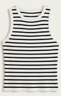 - Righe navy nette e rifiniture a coste sul girocollo e sulle maniche