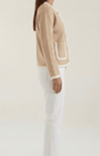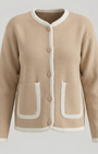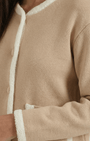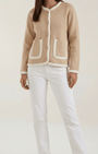 Questo cardigan in maglia presenta una silhouette cropped, bordature in piping a contrasto e bottoni tono su tono che definiscono linee sobrie e raffinate. Aurazio aggiunge una nota di quiet luxury, con tasche a toppa e una lunghezza versatile che si presta a stratificazione con camicie e capi di maglieria.