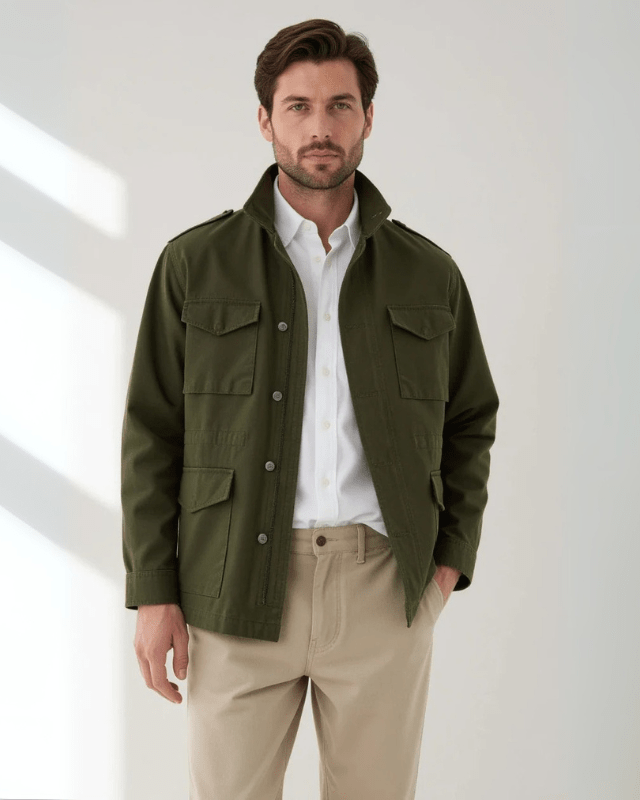 Elegante e pratica, questa giacca da campo in cotone è pensata per offrire utilità raffinata e una sofisticazione senza tempo. Realizzata in cotone twill di prima qualità, è traspirante, resistente e morbida al tatto. Il taglio sartoriale, con finitura leggermente strutturata, regala una silhouette pulita e Aurazio propone questo capo come elemento di stile senza tempo.