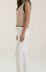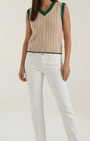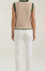 Aurazio propone il gilet, una reinterpretazione contemporanea del classico look da college. Realizzato in maglia di alta qualità con motivo a trecce, presenta dettagli in costina a contrasto sul collo e sugli orli delle maniche, e una silhouette aderente con scollo a V tradizionale. La lunghezza cropped aggiunge un tocco moderno, rendendolo perfetto per layering su camicie, top o vestiti, per un look elegante e rilassato nello stesso tempo.