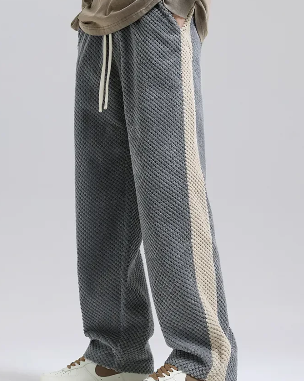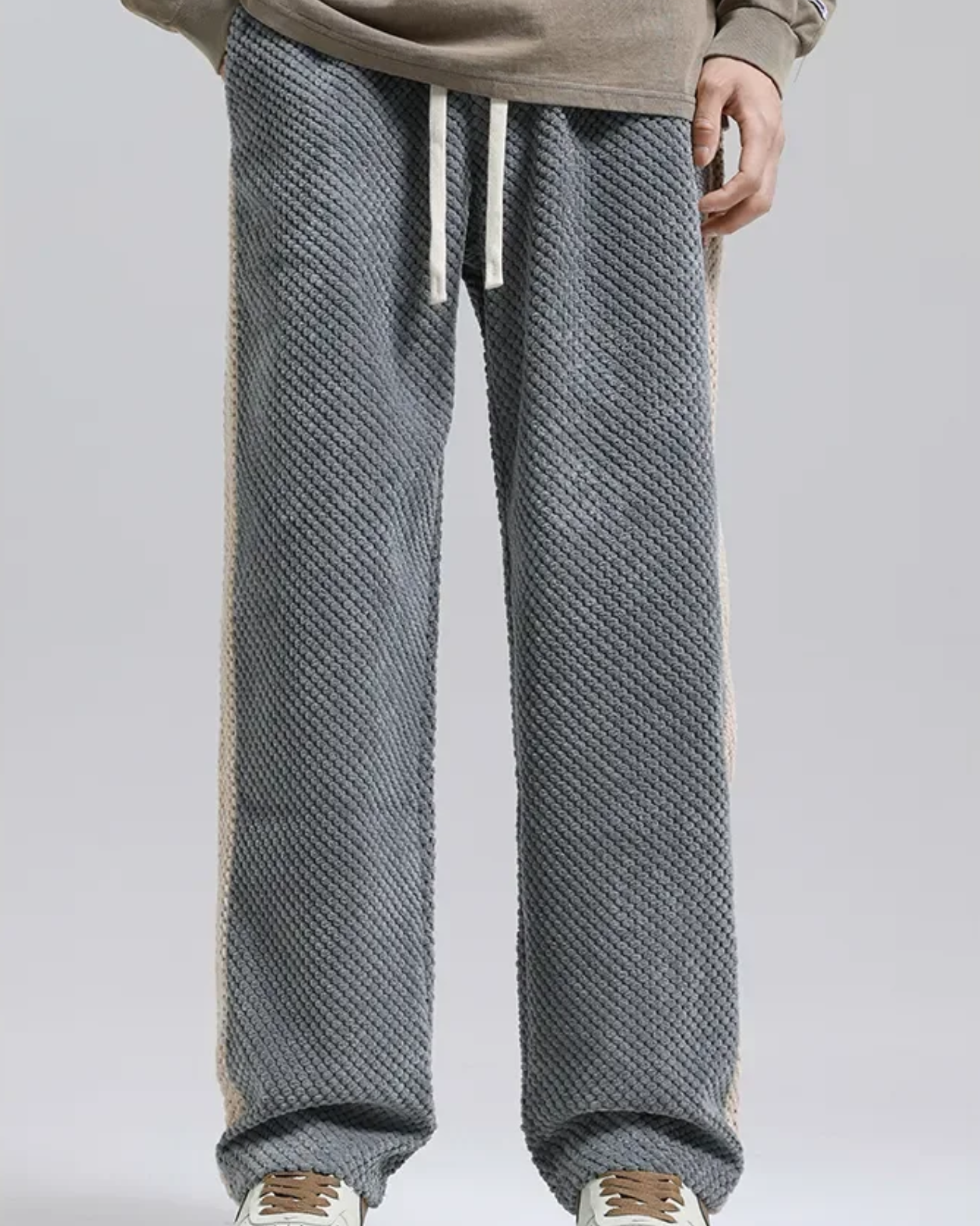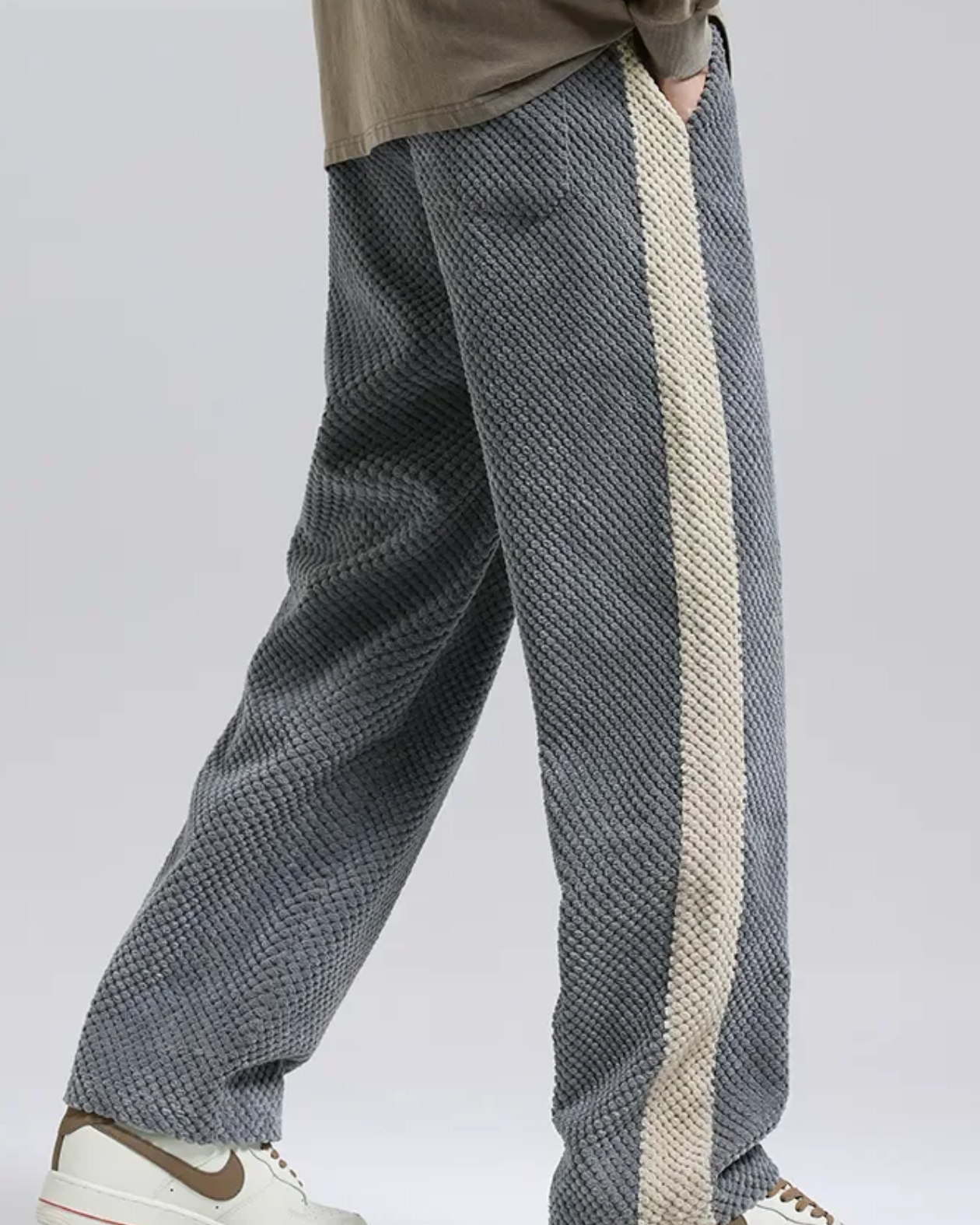 Pensati per i giorni di massimo comfort e per uno stile urbano senza sforzo, questi jogger in velluto a coste dal motivo waffle regalano una texture ricca e una morbidezza avvolgente. Realizzati in maglia pesante, presentano una banda laterale a contrasto che aggiunge carattere al look. Aurazio propone un capo versatile, adatto a outfit quotidiani che coniugano praticità e raffinatezza.