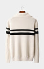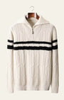 Il maglione da uomo in lana merino con zip a metà unisce una leggerezza calorosa e una mano setosa, con una struttura raffinata che resiste all'uso quotidiano. Realizzato in pura lana merino di alta qualità, è pensato per accompagnarti dalle settimane di freddo alle serate più informali. Il motivo a righe nautiche e i cablati intrecci garantiscono un look distinto, perfetto per layering smart-casual in ogni stagione.