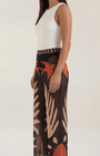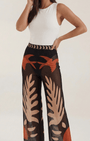 I Pantaloni Beth di Aurazio incarnano lo spirito boho in movimento: una silhouette ampia che scorre con grazia. Realizzati in tessuto leggerissimo di alta qualità, regalano caduta fluida, comfort traspirante e libertà di movimento, perfetti per giornate di vacanza o momenti di relax a bordo piscina. La vita alta, impreziosita da un motivo celeste, garantisce una vestibilità sicura, mentre la stampa artigianale ispirata a foglie tropicali nelle tonalità terracotta, crema e marrone evoca paesaggi esotici e i bagliori del tramonto.