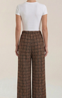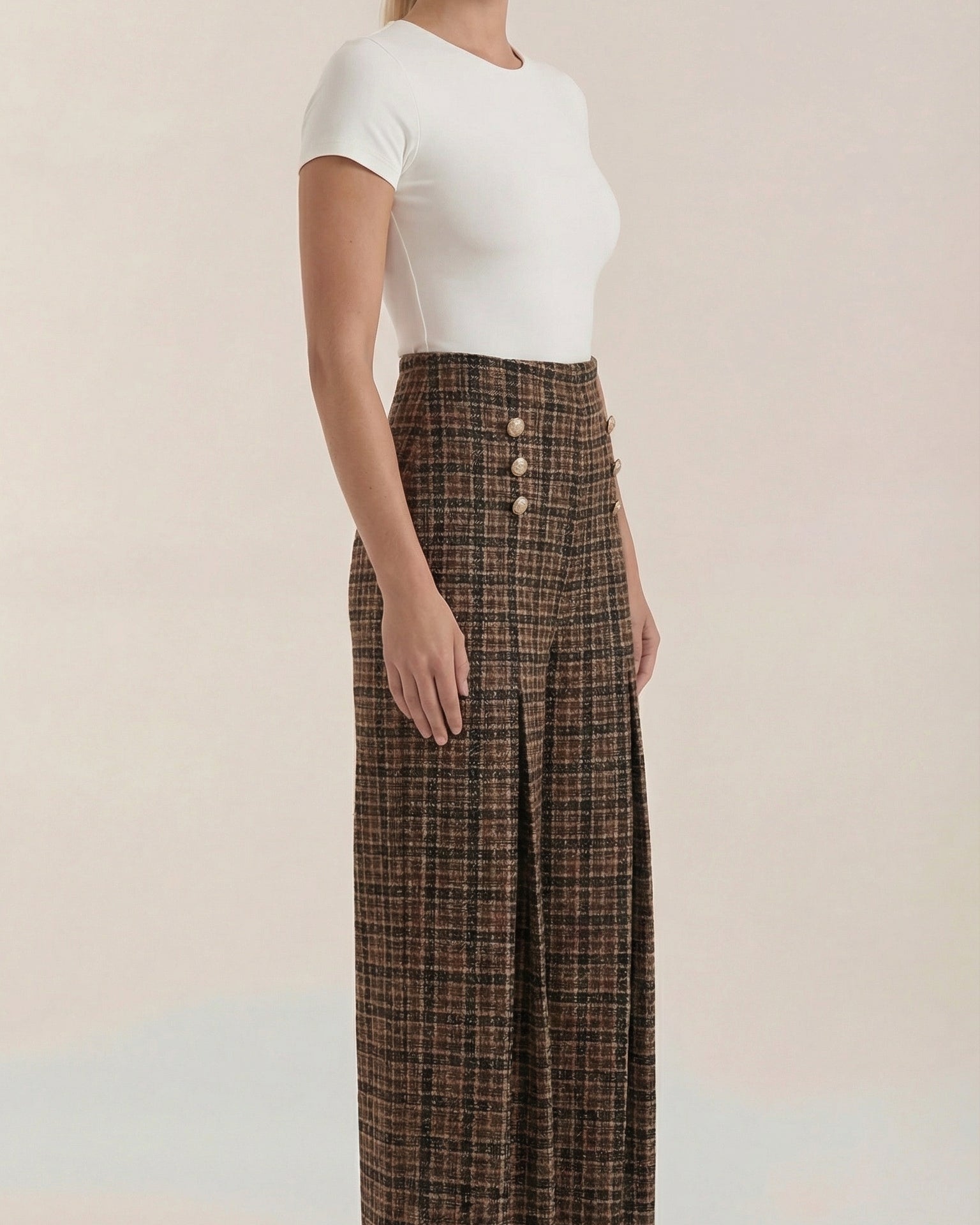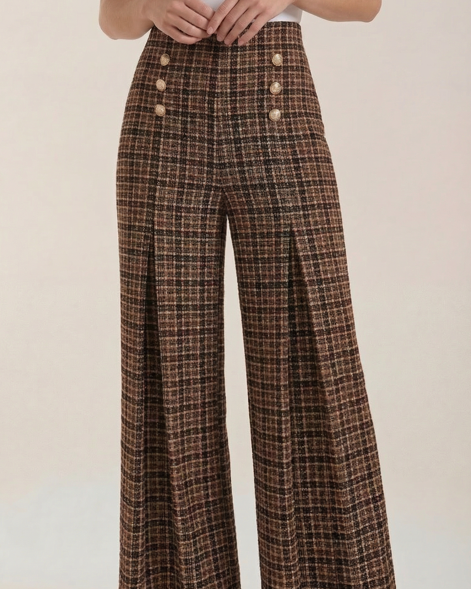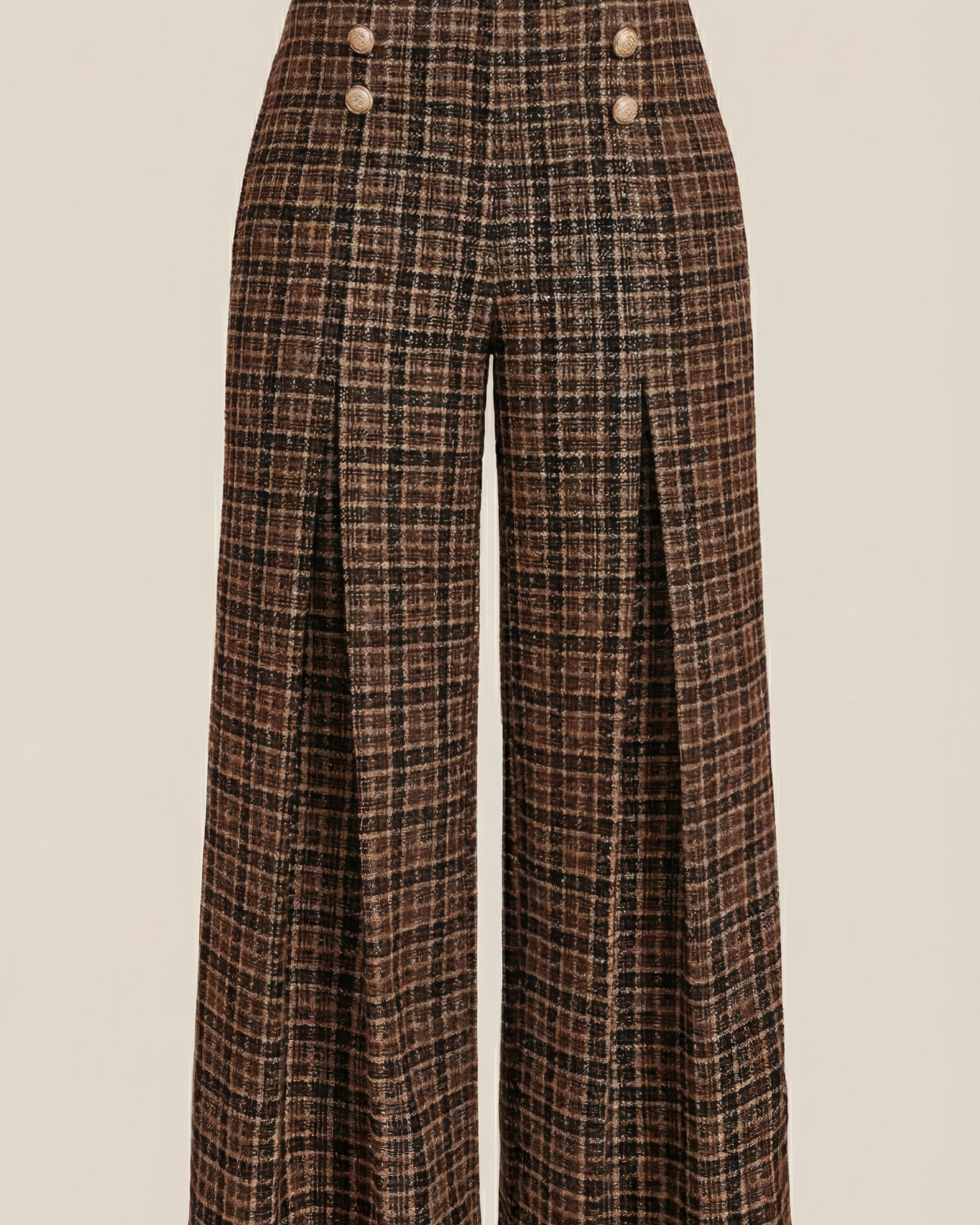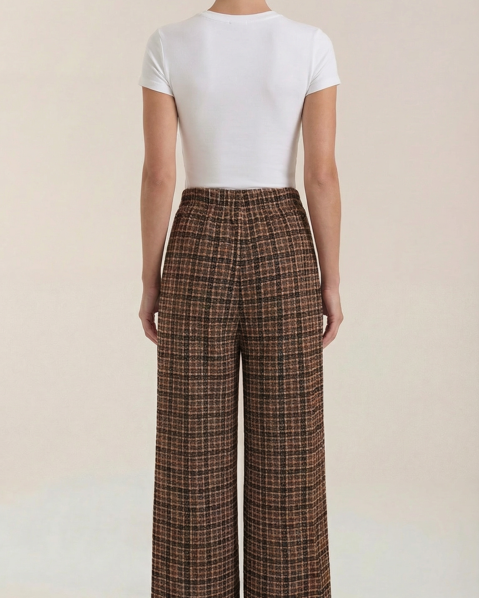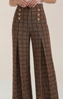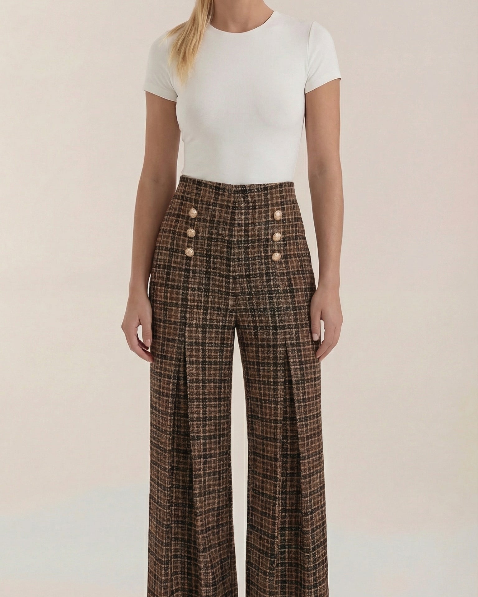 Questo capo Aurazio unisce comfort e stile senza sforzo: una silhouette a palazzo con vita alta definisce la figura, e un tessuto morbido e fluido cede a movimenti naturali. Il motivo quadri aggiunge un fascino classico che si presta sia a look da ufficio sia a momenti di relax nel tempo libero; indossali con camicie pulite o maglioni leggeri per un outfit immediatamente curato.