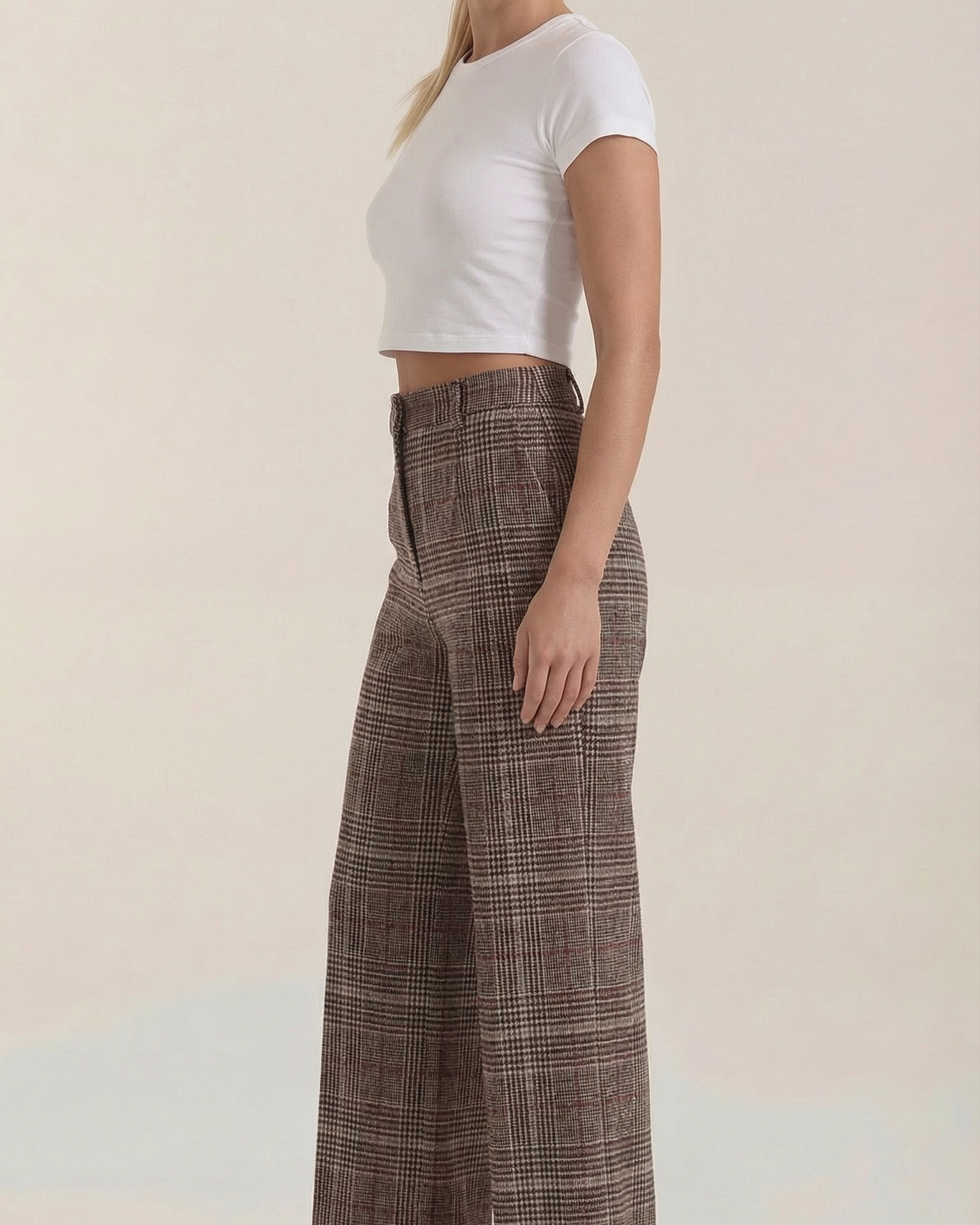 Con la stampa a quadri intramontabile e una silhouette a vita alta, questi pantaloni regalano un’aria di sicurezza elegante. Il taglio a gamba ampia garantisce libertà di movimento e caduta morbida, ideale sia per l’ufficio sia per il brunch del weekend. Realizzati in tessuto di alta qualità, offrono comfort duraturo grazie al drappeggio naturale del tessuto.