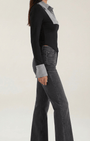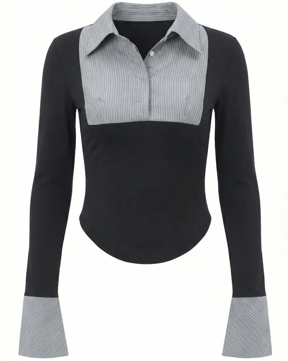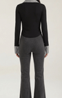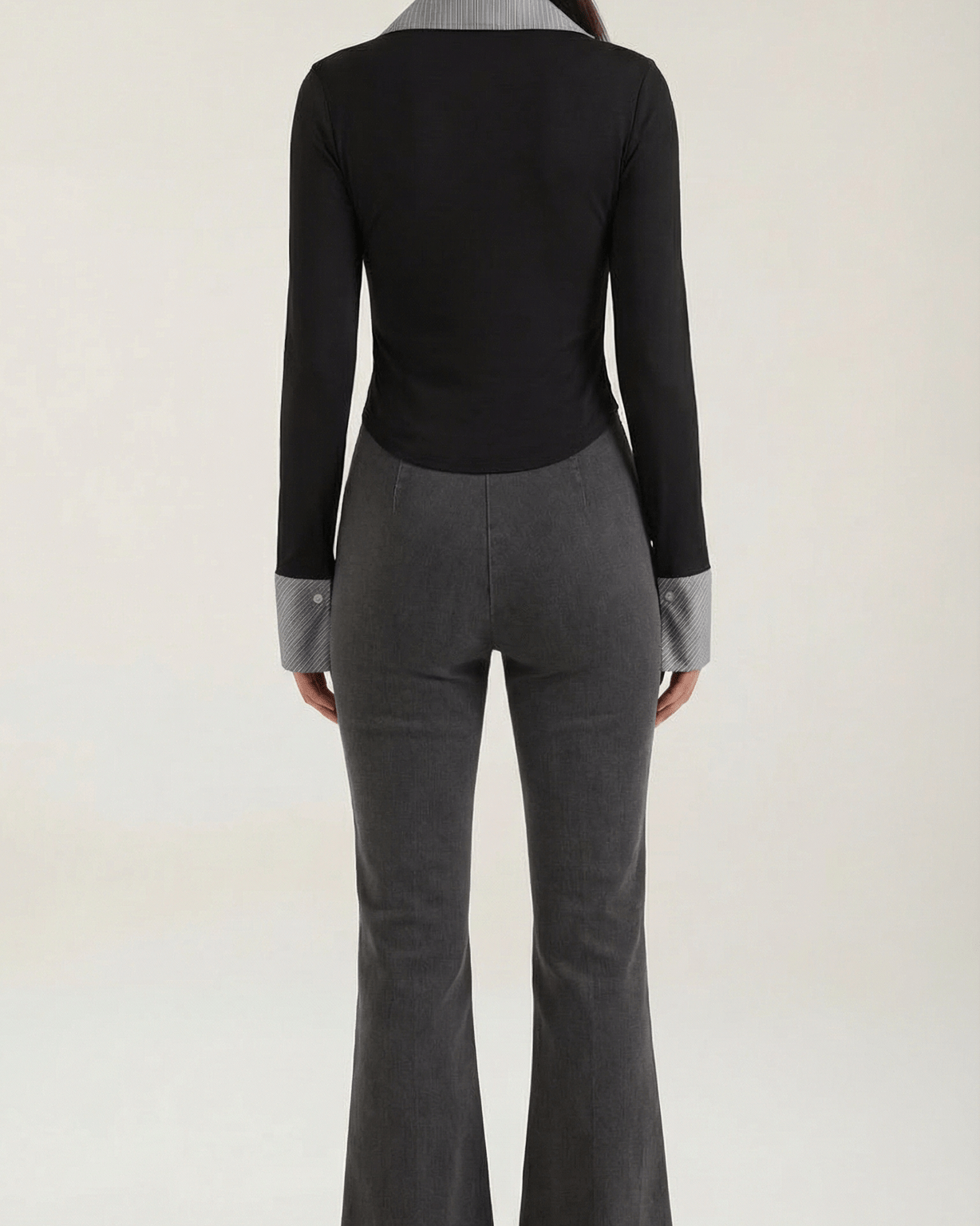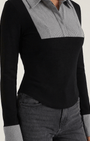 la maglia di Aurazio eleva l’abbigliamento da ufficio. Il bib plissé a contrasto, abbinato a un colletto definito, aggiunge carattere senza ostentazione, mentre la linea aderente, realizzata senza cuciture, crea una silhouette liscia e professionale, perfetta sia per l’ufficio sia per look smart casual nel tempo libero.