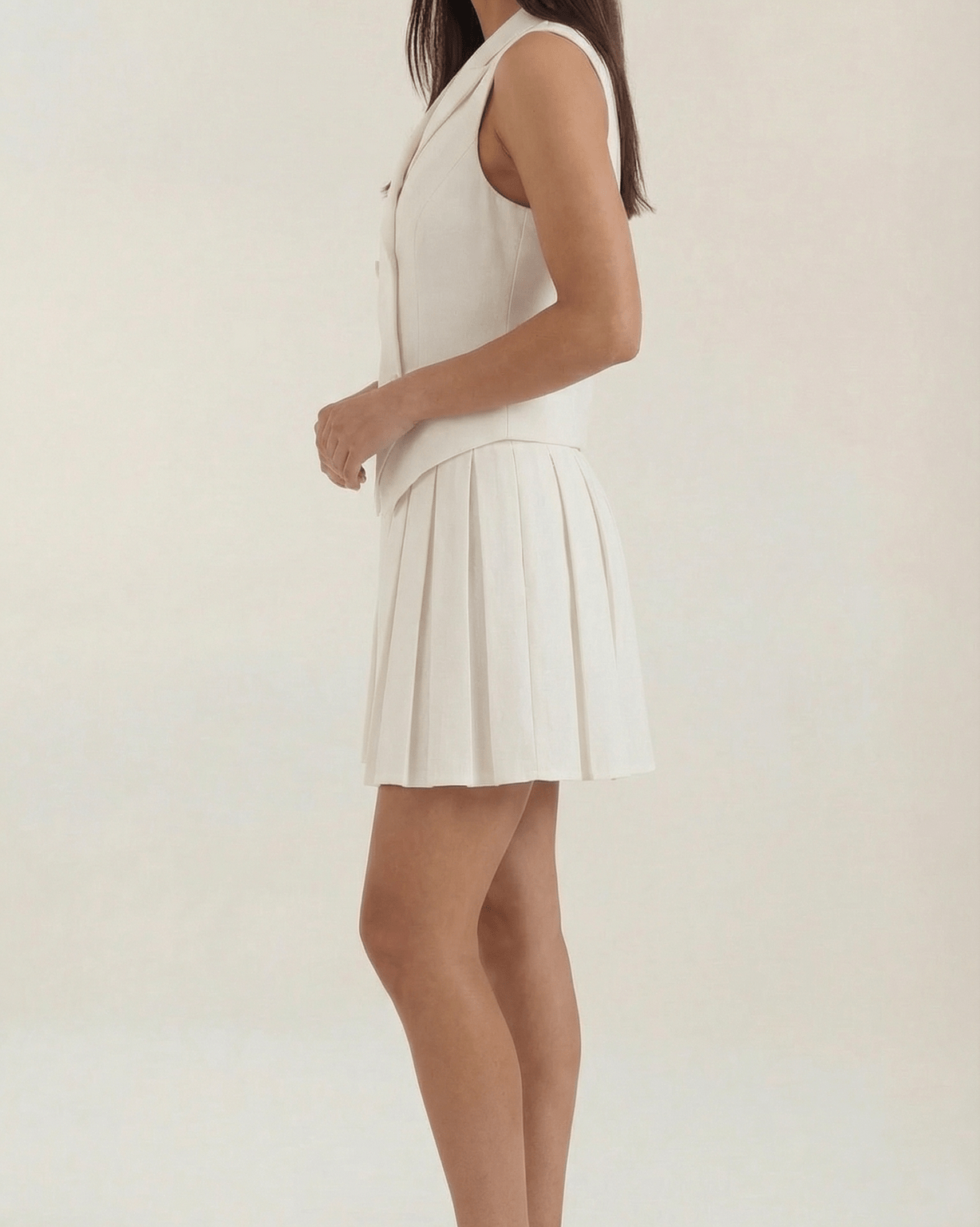 Aurazio propone un vestito blazer mini che trasmette potenza ed eleganza. Il corpetto strutturato a blazer, impreziosito da bottoni dorati, si abbina a una gonna mini plissettata per un movimento raffinato. Il design senza maniche mantiene freschezza e professionalità, rendendolo ideale per eventi di lavoro, garden party e occasioni in cui si desideri un look deciso ma contemporaneo.