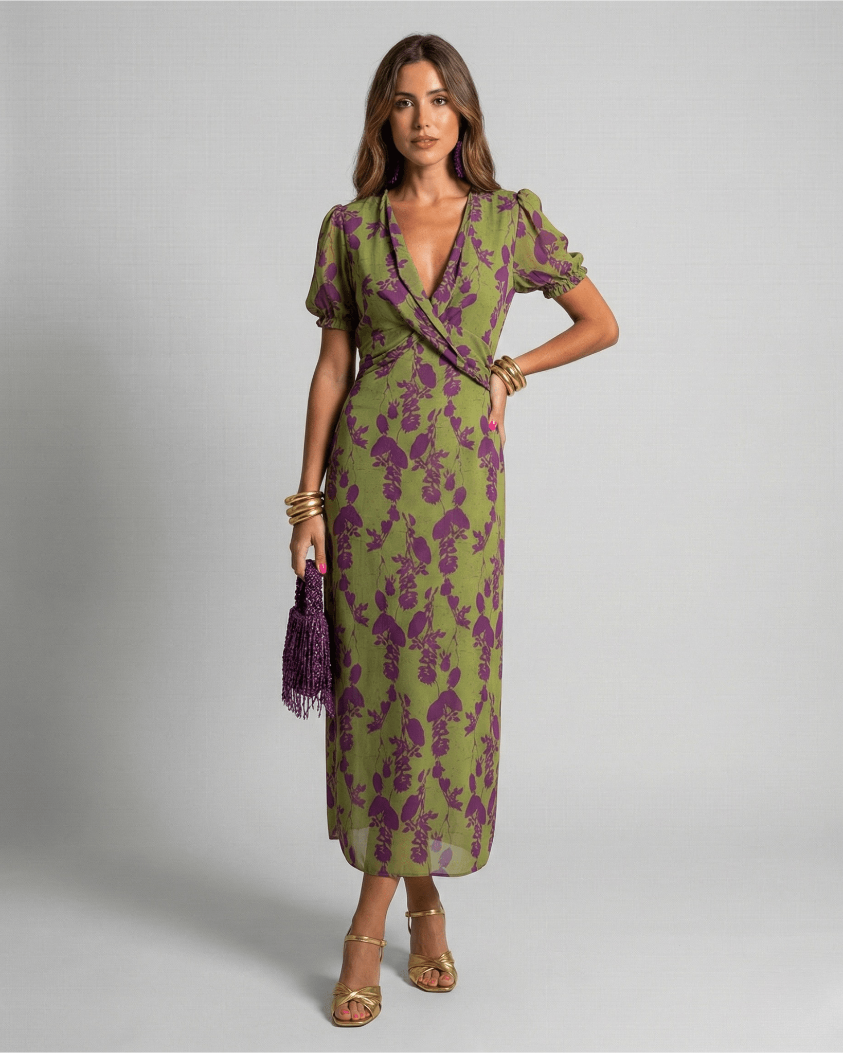 Eleganza Avvolgente: Vestito Midi a Portafoglio con Maniche a Sbuffo