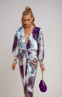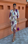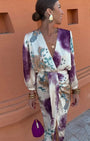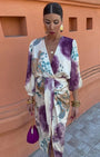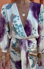 Questo vestito firmato Aurazio cattura l’eleganza delicata con una stampa ispirata all’acquerello nei toni viola, blu e bianco. Il design wrap, lo scollo a V profondo e la silhouette fluida creano un look raffinato, perfetto per occasioni speciali. Realizzato in tessuto morbido e confortevole, accompagna la figura con grazia dall’aperitivo alla serata.