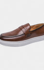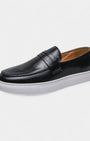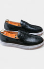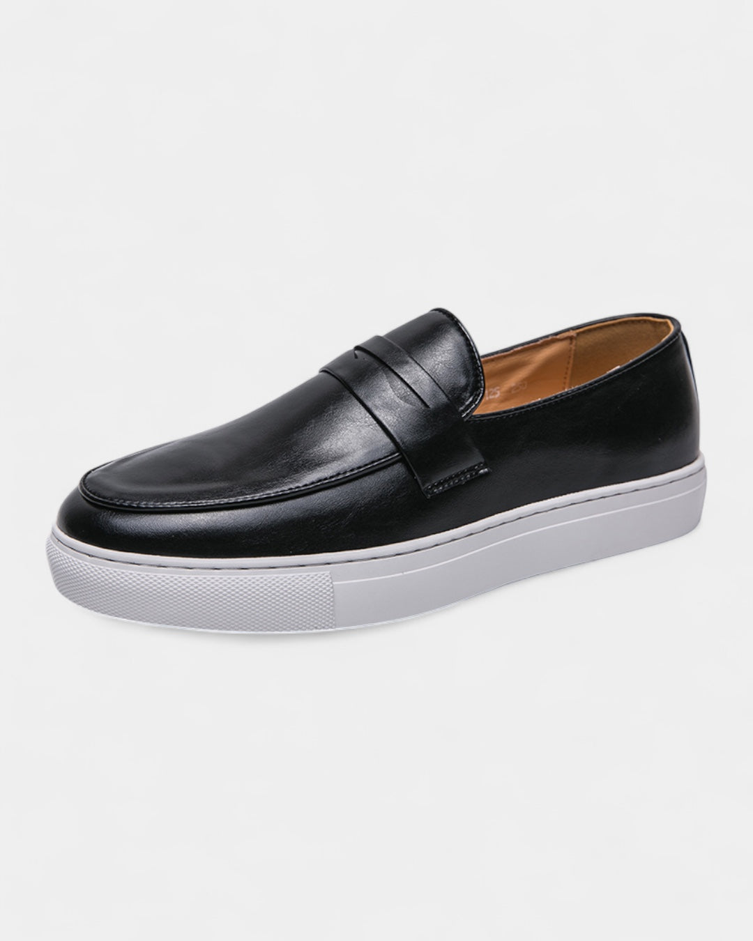 Mocassino slip-on a profilo basso con tomaia in pelle e fascetta sul collo del piede. La cucitura a vaschetta definisce la punta; la suola bianca a contrasto dona un carattere contemporaneo, facile da abbinare dal casual curato all’ufficio informale.
