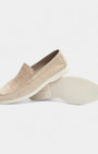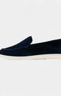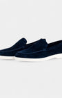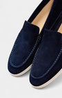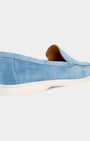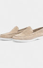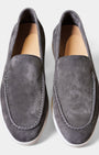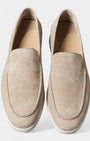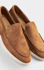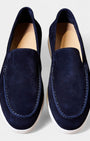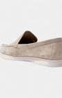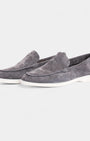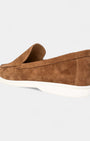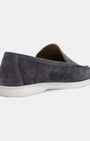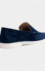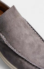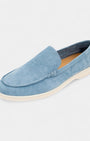 Mocassino slip-on in camoscio con cucitura a vaschetta e profilo basso. Linee pulite e suola bianca a contrasto per uno stile contemporaneo, facile da abbinare dal casual curato all’ufficio informale.